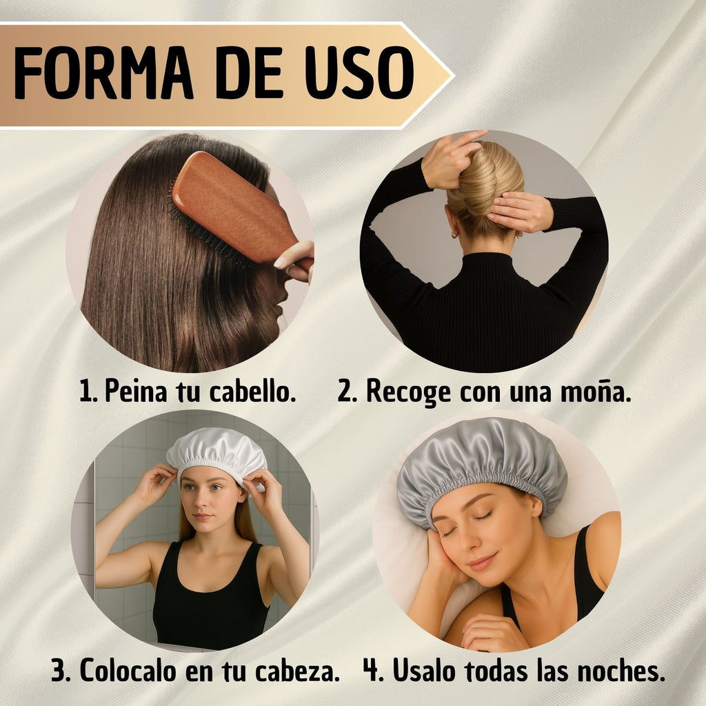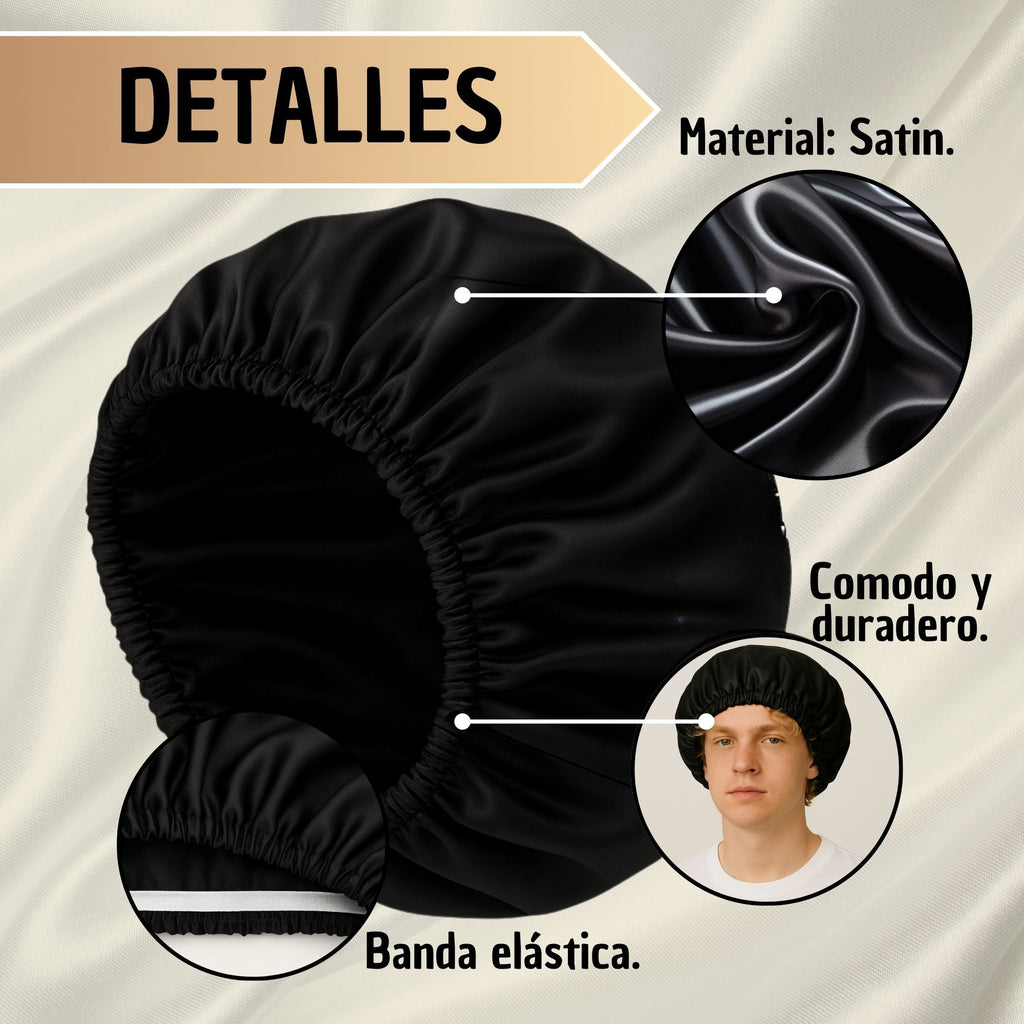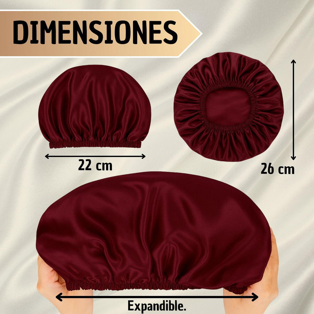 Es un gorro de satín para dormir diseñado para proteger el cabello durante la noche, reducir el frizz y mantener peinados, rizos o alisados por más tiempo. Ayuda a conservar la hidratación natural del cabello mientras duermes.