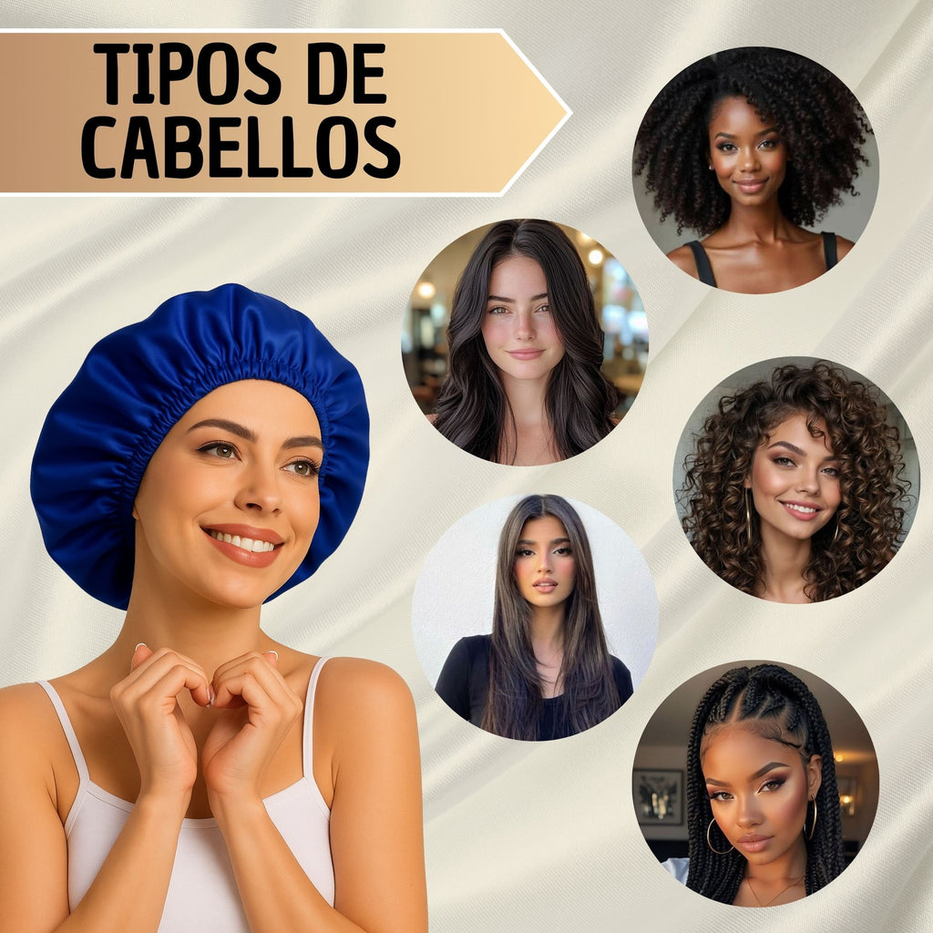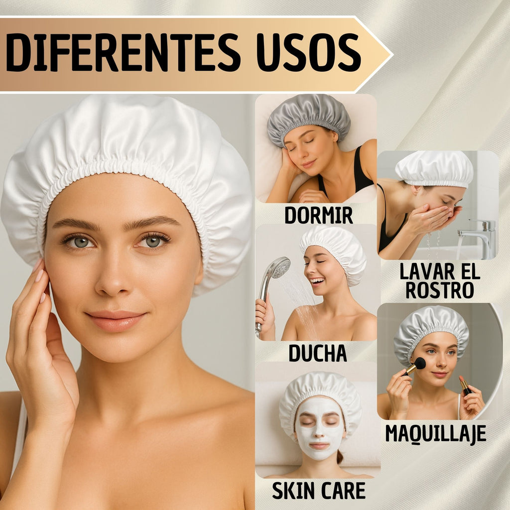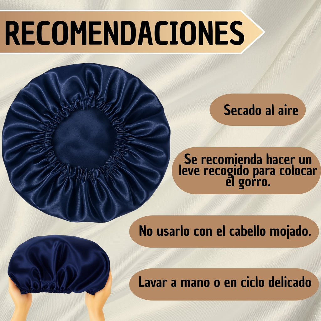 Es un gorro de satín para dormir diseñado para proteger el cabello durante la noche, reducir el frizz y mantener peinados, rizos o alisados por más tiempo. Ayuda a conservar la hidratación natural del cabello mientras duermes.