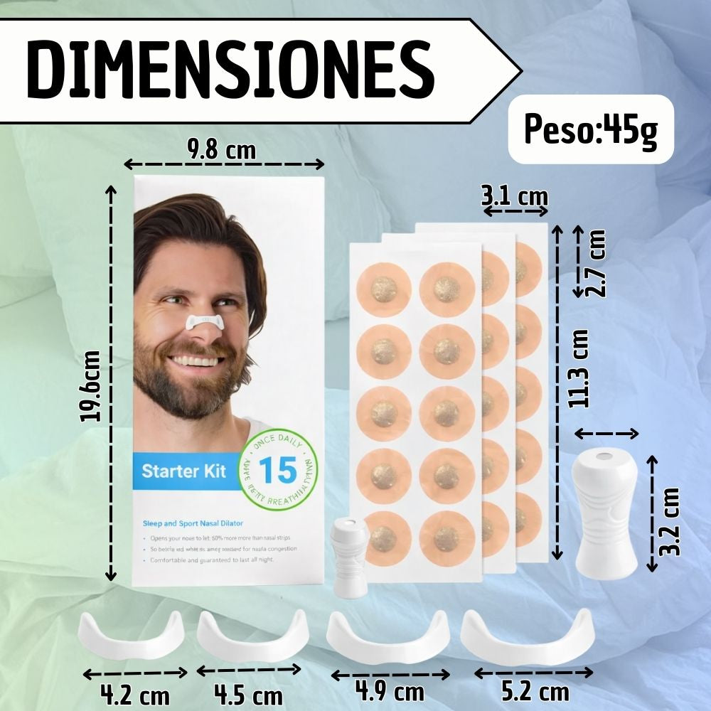 Es un kit de dilatador nasal, diseñado para mejorar la respiración al abrir suavemente las fosas nasales. Ayuda a reducir los ronquidos, aliviar la congestión nasal y mejorar el rendimiento deportivo y la calidad del sueño. Es una alternativa eficaz y cómoda a las tiras nasales tradicionales.