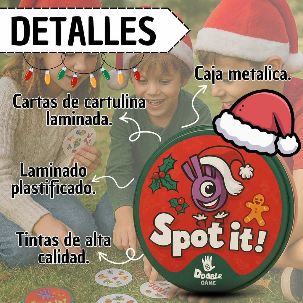 Spot It Navideño es un emocionante juego de cartas diseñado para poner a prueba tu agilidad mental y la de tus amigos y familiares. Con un formato físico que incluye 30 cartas y una caja resistente, este juego es perfecto para reuniones y celebraciones navideñas. Ideal para un mínimo de 2 y un máximo de 5 jugadores, es una opción entretenida para todas las edades a partir de los 5 años.